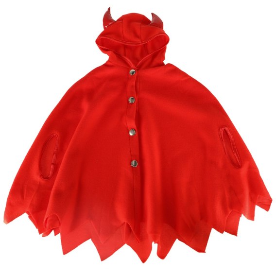 Czerwona peleryna jest wykonany z przyjemnego w dotyku materiału i jak tak uszyty, aby zapewnić swobodę ruchów, umożliwiając dziecku zabawę. Zapinana jest na cztery zatrzaski i ma kaptur z rogami. Rękawiczki mają puszek na brzegu, co stanowi interesujący akcent.