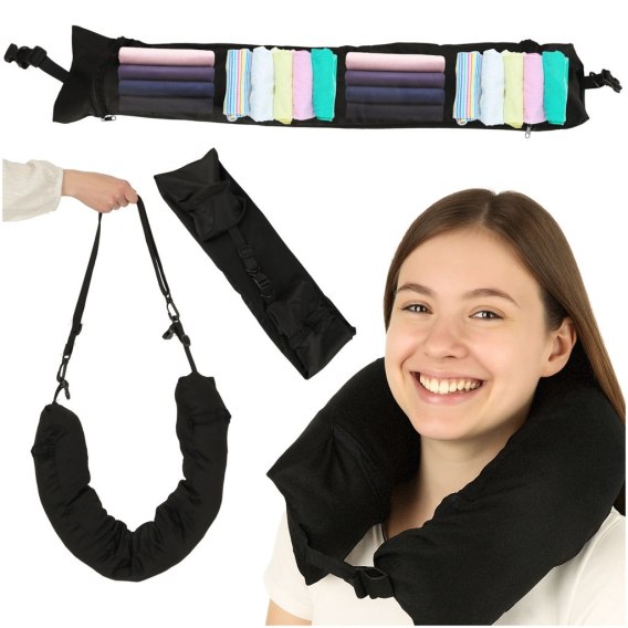 Poduszka turystyczna podróżna rogal zagłówek na szyję schowek do wypełnienia czarna